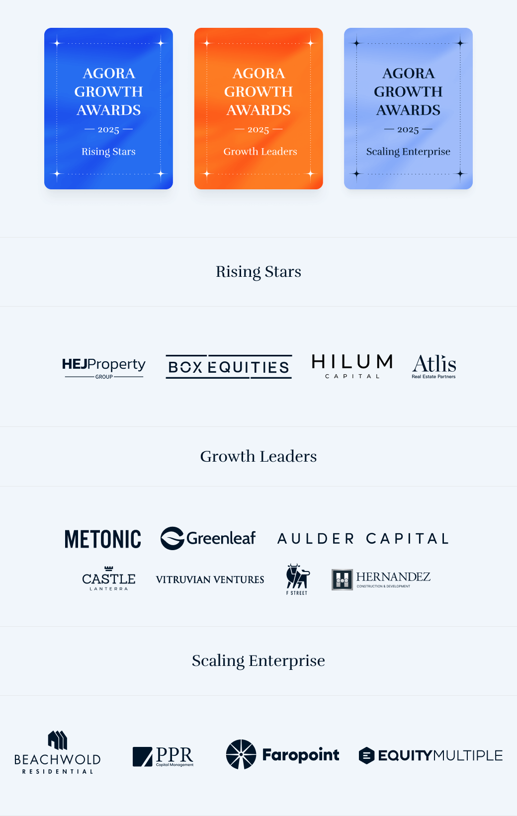 We’re thrilled to announce the Agora Growth Awards 2025, recognizing top-performing real estate investment firms that have demonstrated exceptional growth and fundraising success over the past year.