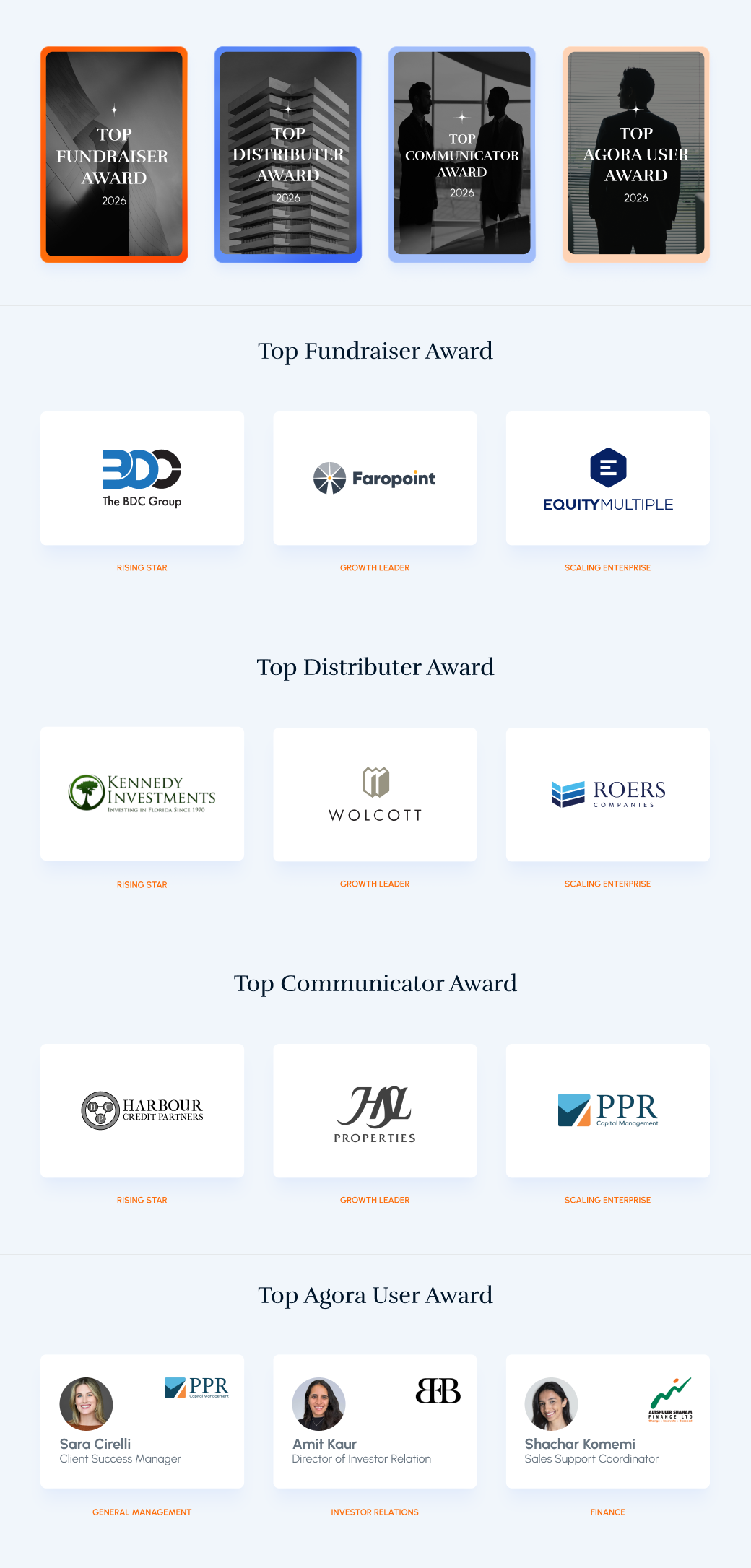 Each year, the Agora Growth Awards celebrate leaders who are raising the bar for how real estate firms raise capital, communicate with investors, and operate at scale. This year’s winners reflect excellence across multiple dimensions of growth, from fundraising momentum to operational execution.