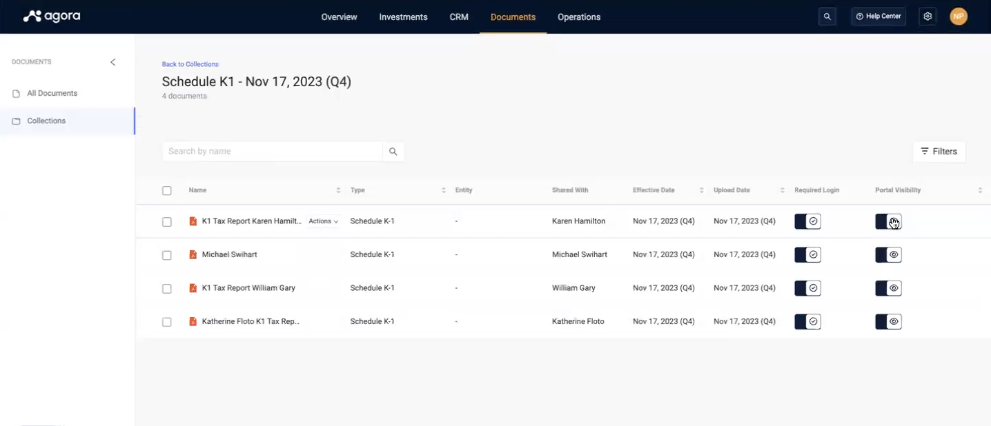 “We have around sixteen entities with all separate K-1s, and you know that’s very time-sensitive for investors. They need it right away. So what took me previously four days now takes one hour with Agora. The K-1 document distribution to investors is fully automated and secure, saving me significant time and ensuring investors can submit their K-1s on time. It’s a win-win for everyone.”