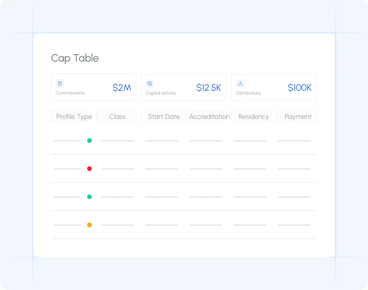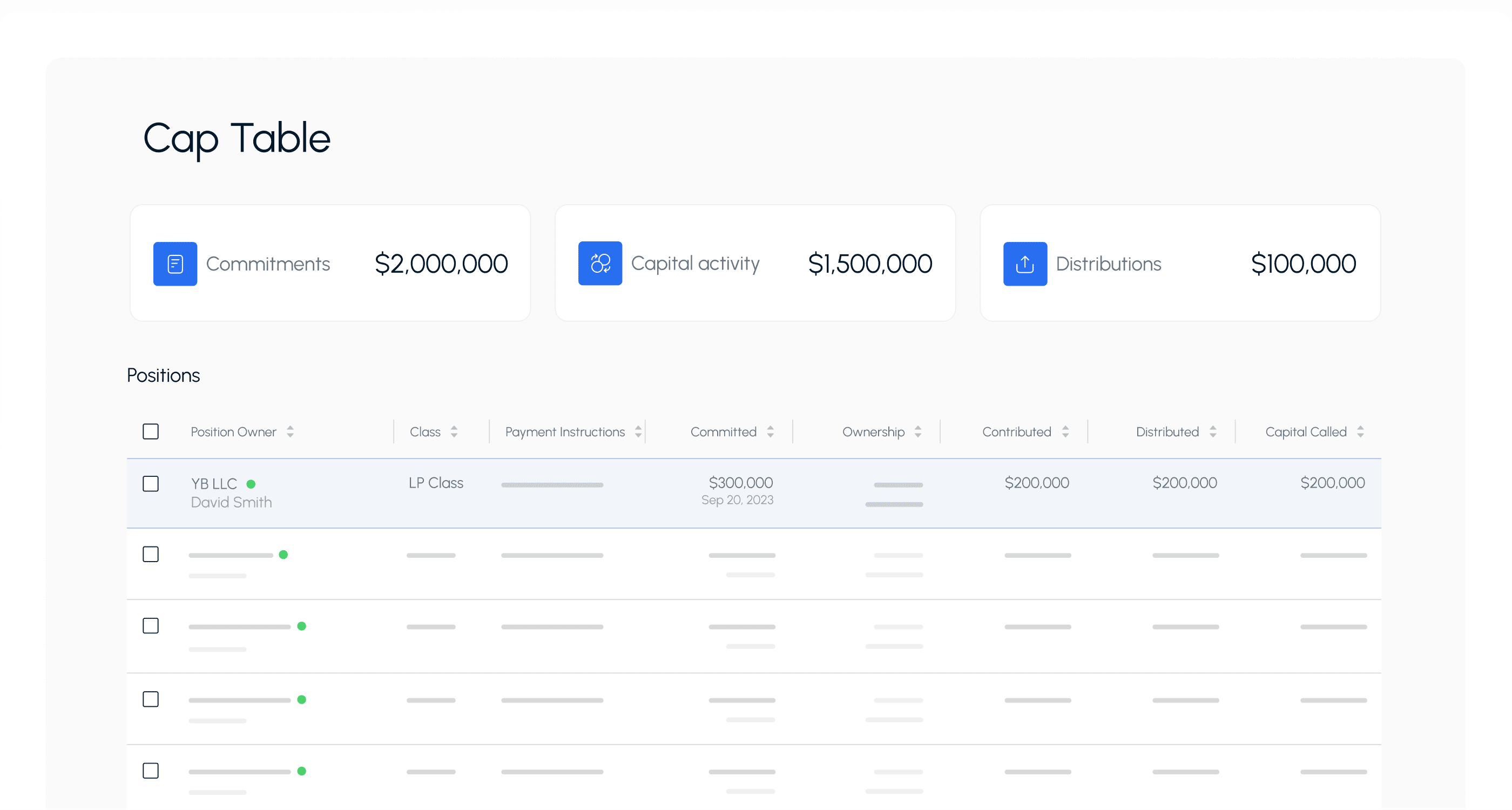 Gain immediate access to comprehensive information on your investor cap table, including detailed investment positions. View a complete list of all your investors, their investment amounts, investor classes, ownership percentages, total distributions, equity balances, and more, all in one place.