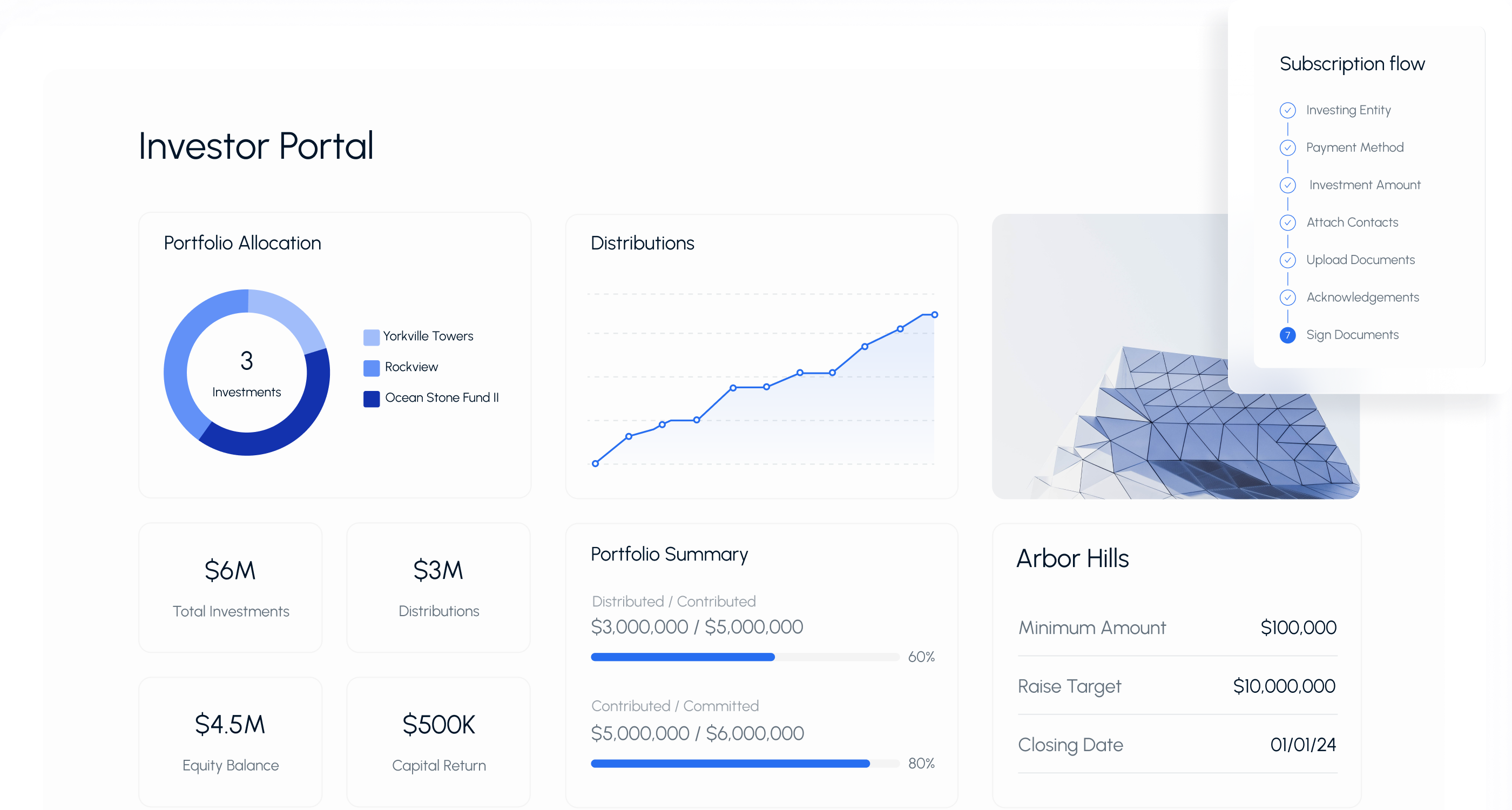 - Digital subscriptions: Once an investor commits to a project, onboarding is simple. A guided questionnaire takes them through the process, including automated accreditation checks and fund collection. You can also track status and step in if an investor gets stuck.