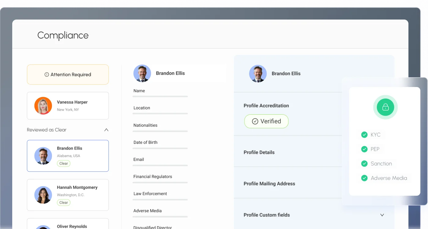 - Integration with CRMs and investor portals: Keeping all information in a centralized location gives you a complete view of the investor’s verification history and financial transactions.