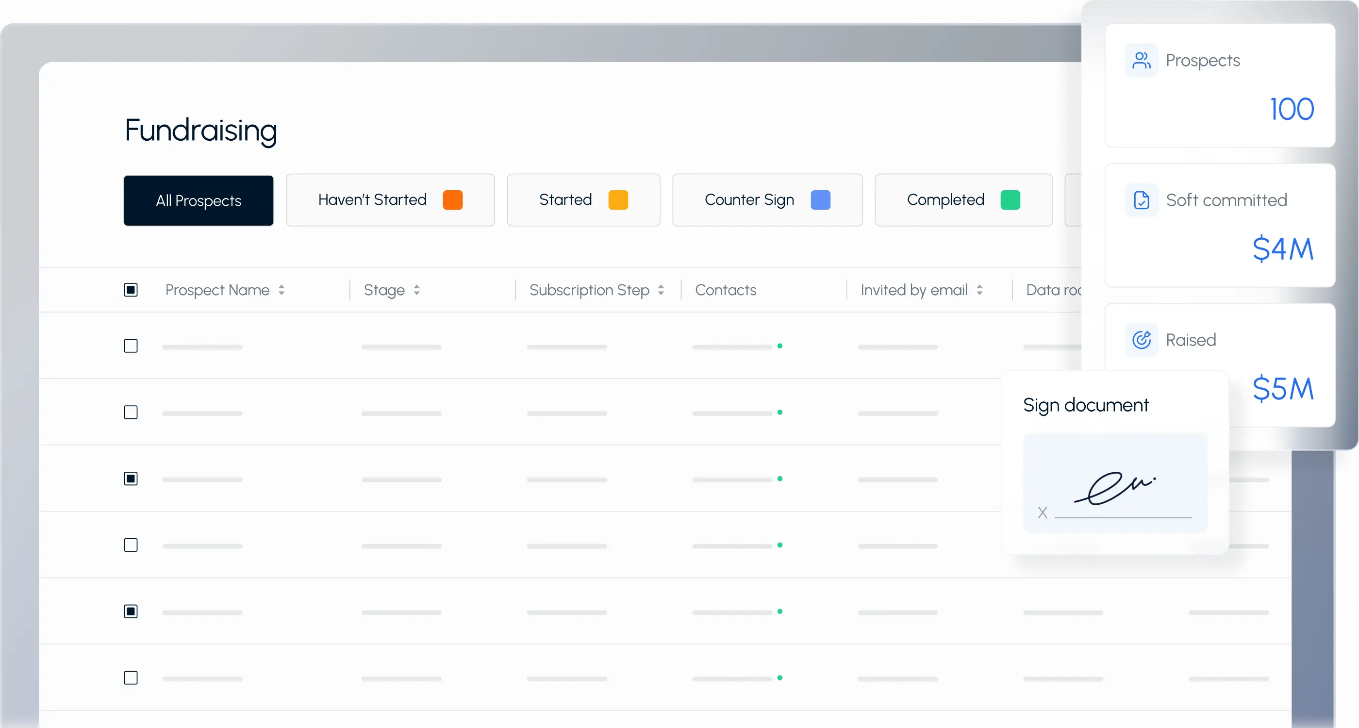 Know exactly where each of your leads is in the process, from initial interest to completed subscriptions. Manage the entire investment pipeline and all prospective investor types including individuals, family offices, and institutional investors.