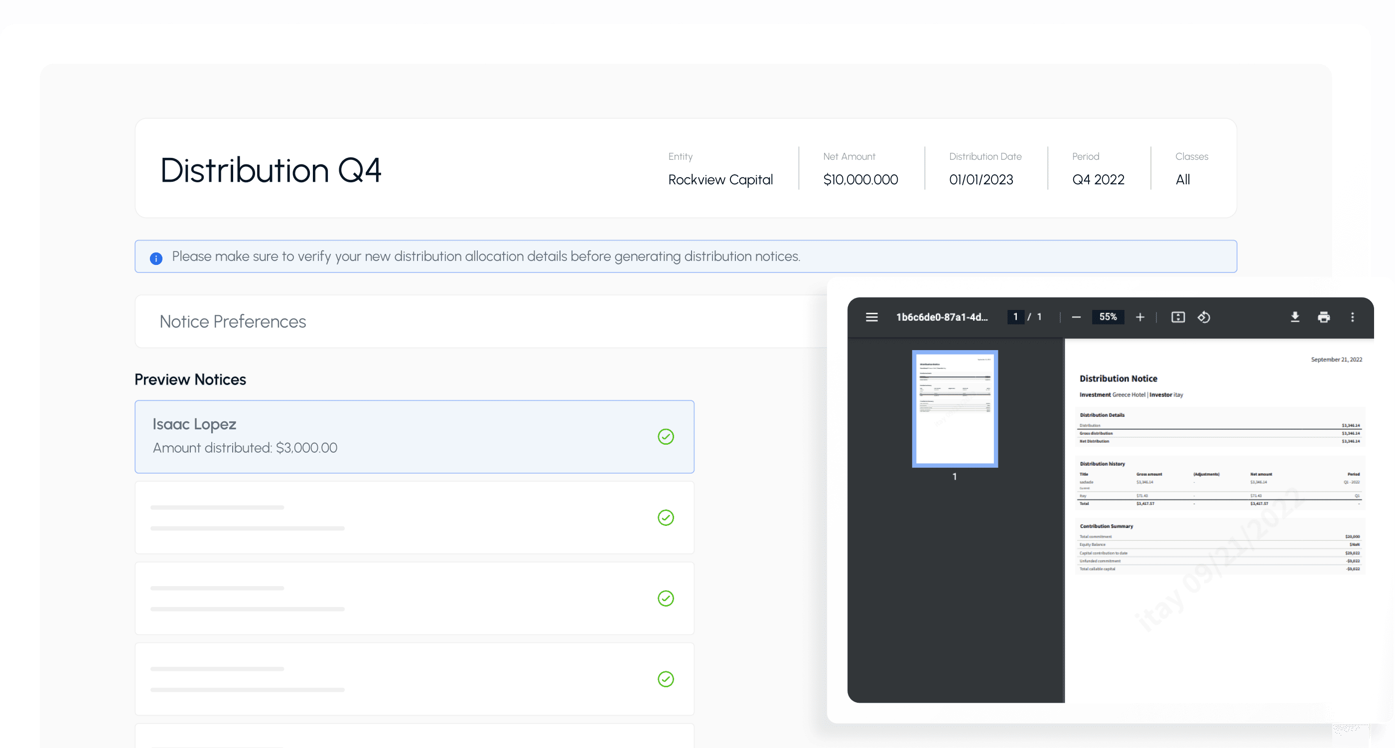 - Distribution notices: Personalized reports for each investor with comprehensive breakdowns.